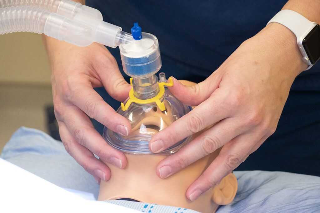 The anesthesia provider may instruct the circulating nurse who stands on the right side of the bed and the patient, to hold the oxygen facemask while the patient is pre-oxygenated with 100% oxygen prior to induction with IV medications or inhalation agents.