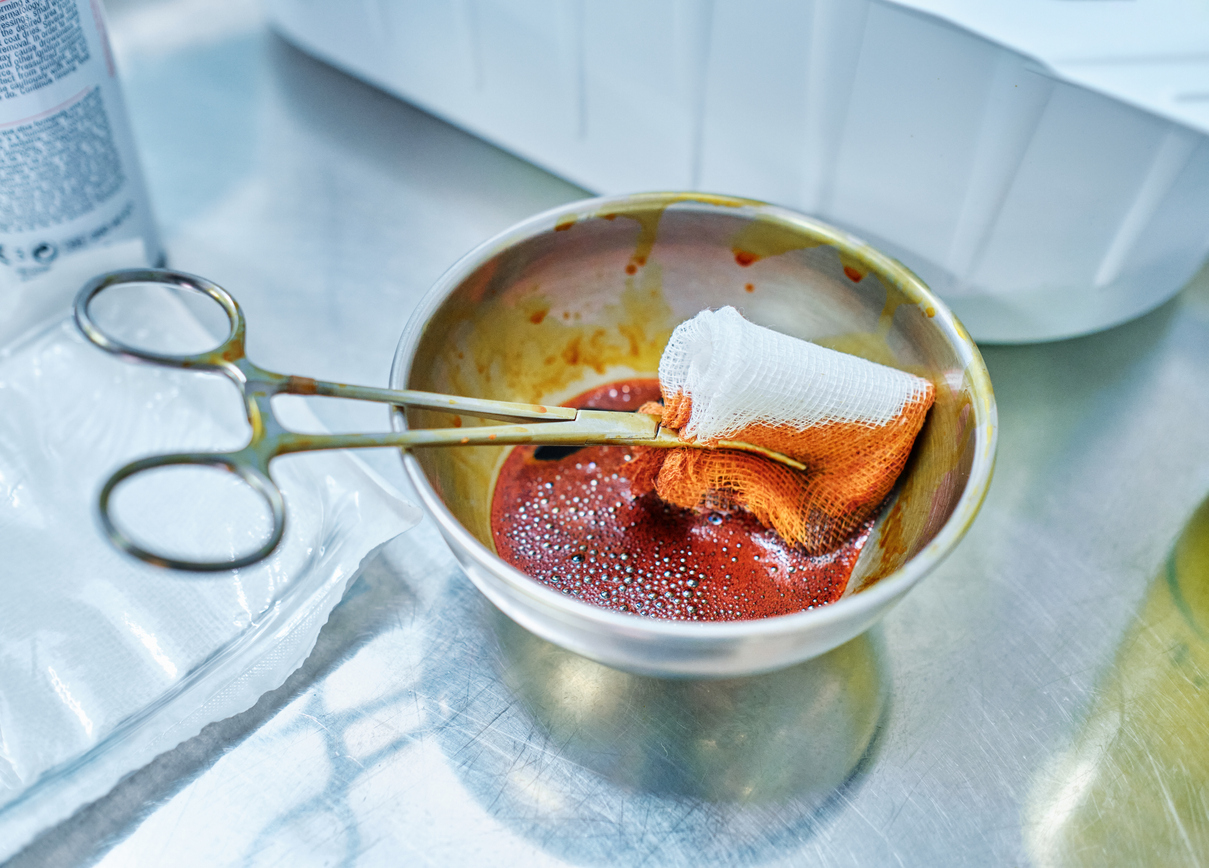 - When dry, remove the clear dressing, and sponge from the stoma, and prep the site with povidone. Allow it to dry and cover it with a clear sterile adhesive dressing.