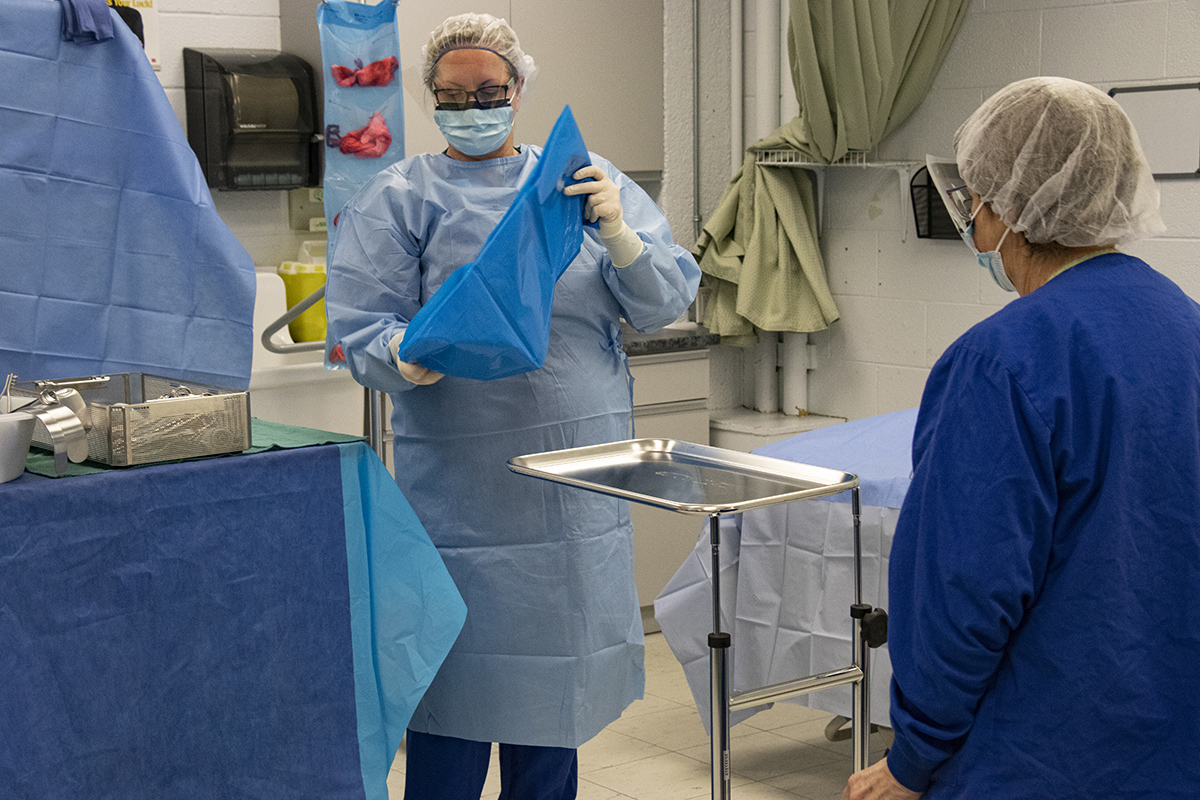 The surgical team creates a ‘sterile field’ by applying sterile surgical drapes over the patient and any surrounding equipment or surfaces that scrubbed personnel may encounter. The drape which covers the patient is placed in such a manner that the surgical site which has been ‘prepped,’ is the only skin surface that is exposed.